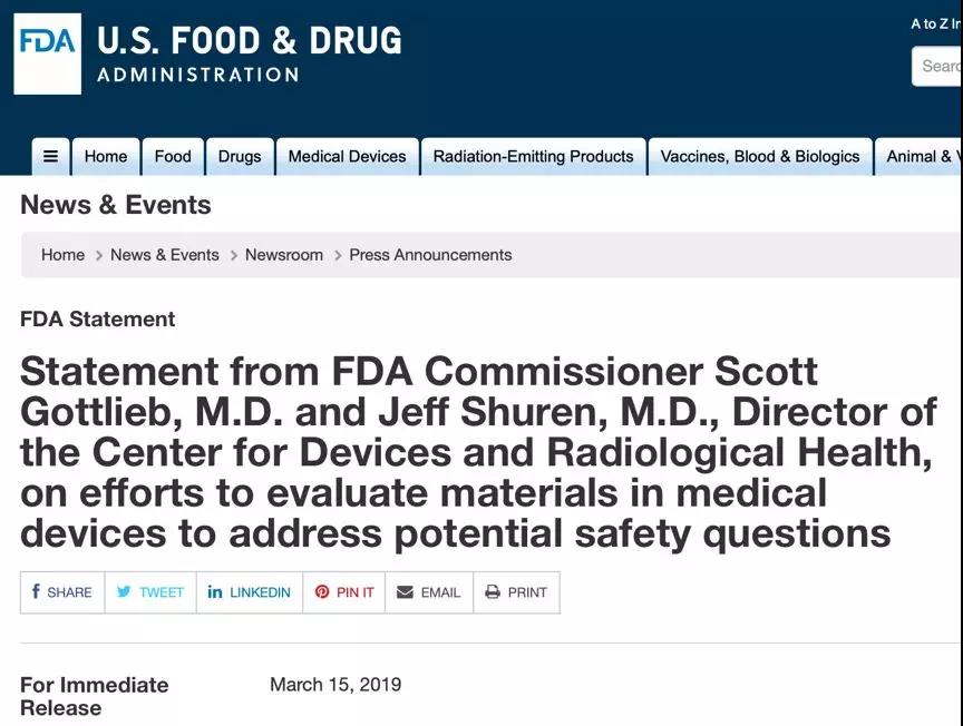 (截圖來源:FDA官網—FDA專員、醫(yī)學博士Scott Gottlieb和設備與放射健康中心主任Jeff Shuren關于評估醫(yī)療器械材料以解決潛在安全問題的聲明)